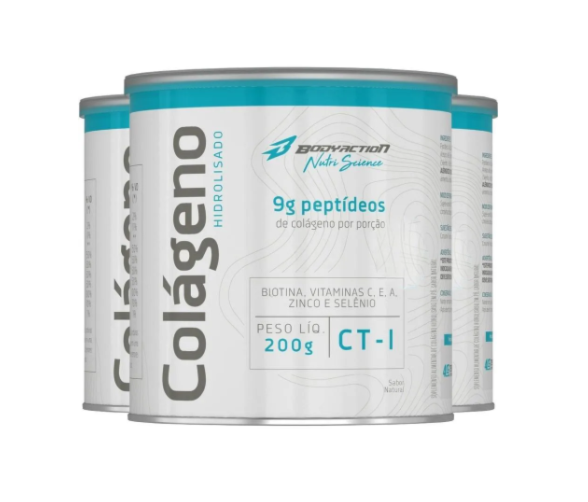 COLÁGENO HIDROLISADO CT-1 NUTRI SCIENTE® - BODYACTION Conheça o novo Colágeno CT-1 Nutri Science em pó da Bodyaction. Com 9G de peptídeos de colágeno por dose, ele é 100% Hidrolisado e fornece as proteínas e vitaminas necessárias para melhora da saúde dos cabelos, unhas e pele, além de prevenir o aparecimento de estrias e marcas de expressão. Contém as Vitaminas C, E, A, Zinco e Selênio. Experimente o poder do Novo Colágeno Bodyaction Nutri Science. O ÚNICO COM TÉCNOLOGIA ABSORB® O Colágeno Hidrolisado CT-1 Nutri Science® é o único desenvolvido com a tecnologia AbSorb® onde ele é submetido à uma quebra de partículas 5x vezes menores, através de equipamentos Micro-Mesh de última geração. O resultado disso é uma absorção mais rápida e completa. Toda essa tecnologia foi desenvolvida pensando em você para que os resultados apareçam mais rápidos e com resultados nítidos. Com o Colágeno CT-1 Nutri Science, você vai experimentar a sensação de uma pele mais jovem e um corpo mais firme. De pureza incomparável e com um alto teor proteico, o Colágeno CT-1 é 100% hidrolisado, o que permite uma maior absorção. Colágeno é uma proteína que dá sustentação às fibras elásticas da pele e melhora a saúde das unhas, cabelos e articulações, e como deixa de ser produzido gradativamente a partir dos 30 anos, a suplementação se faz necessária para quem quer ter uma aparência mais jovem e com menos flacidez tecidual. Após os 50 anos formam-se apenas 35% do que é necessário, e esta falta pode ser notada pelo aparecimento de rugas, a redução da elasticidade da pele e fragilidade óssea. O colágeno é sintetizado com mais eficiência quando consumimos com vitamina C, vitamina E, zinco e selênio. O Colágeno Hidrolisado CT-1 da Bodyaction, contém 9g de colágeno hidrolisado puro, com apenas 35 calorias por porção e é enriquecido com as vitaminas E, A, C, Zinco e Selênio capazes de neutralizar os radicais livres que provocam danos celulares, acarretando a deterioração do colágeno. O colágeno hidrolisado possui micropartículas que são absorvidas com mais facilidade pelo nosso organismo. Apresentação: Potes com 200 g Sabores: ABACAXI COM HORTELÃ | LARANJA COM ACEROLA | LIMÃO E CLOROFILA | UVA | NATURAL Ingredientes: Colágeno Hidrolisado, Vitamina A (Acetato de Retinol), Vitamina C (Ácido Ascórbico), Vitamina E (DL Alfa Acetato de Tocoferol), Zinco (Sulfato de Zinco Monohidratado), Selênio (Selenito de Sódio), Peptídeos de Fécula Hidrolisada, Acidulante Ácido Cítrico, Antiumectante Dióxido de Silício, Edulcorante Natural Stevia. Modo de Preparo: Adicione 10g (2 scoops) em 200mL (1 copo) de água ou bebida de sua preferência e mexa até completa dissolução. Pode ser consumido quente ou frio. Não utilize água fervendo. Advertências: “CONSUMIR PREFERENCIALMENTE SOB ORIENTAÇÃO NUTRICIONAL E/OU MÉDICO”. NÃO CONTÉM AÇÚCARES. ADOÇADO NATURALMENTE COM STÉVIA DOS ANDES. Conservação: Mantenha fora do alcance de crianças. Manter em lugar fresco, não úmido e ao abrigo de luz. Não consumir o produto se o lacre de proteção estiver violado.