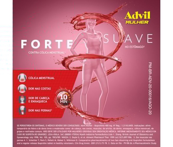 Advil Mulher é forte contra as cólicas menstruais, e suave para o estômago - Possui a avançada tecnologia das cápsulas líquidas que é absorvida rapidamente, a partir de 10 minutos, aliviando também dores relacionadas ao período menstrual como dor de cabeça, enxaqueca, dor nas costas e dor nas pernas - Vide bula do produto.