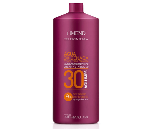 Água Oxigenada 30 volumes Amend Color Intensy 950ml Especialmente desenvolvida para o uso com os produtos da linha Amend Color Intensy. Descolore e auxilia no tingimento dos cabelos.