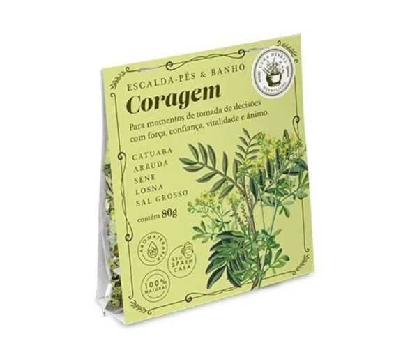 "Descrição: Os banhos de ervas possuem diversos benefícios medicinais que agem tanto no campo físico como espiritual. O Banho de Coragem é indicado para momentos de tomada de decisão com força, confiança, vitalidade e ânimo.Composição: Catuaba, Arruda, Sene, Losna e Sal Grosso.Modo de uso: ESCALDA-PÉS: Adicione a mistura de ervar e sal na água quente em um ofurô ou bacia e imerja os pés cuidadosamente.BANHO: Adicione a mistura de ervas em um infusor ou então saquinho de filó, imerja-o na banheira ou pendure no chuveiro. Você também pode acrescentar gotas de seu óleo essencial de preferência. "