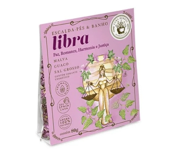 "Descrição: Os banhos de ervas possuem diversos benefícios medicinais que agem tanto no campo físico como espiritual. O Banho Astrológico de Libra é composto de sal grosso, Malva e Guaco que atrai Paz, Romance e Harmonia. A Malva e o Guaco possuem propriedades purificantes, antissépticas e antioxidantes; assim atuam como desintoxicantes do organismo. Isso acontece, pois, nossos pés possuem terminações nervosas interligadas ao nosso corpo, que quando trabalhadas ajudam a restabelecer o equilíbrio energético.Modo de uso:ESCALDA-PÉS: Adicione a mistura de ervar e sal na água quente em um ofurô ou bacia e imerja os pés cuidadosamente.BANHO: Adicione a mistura de ervas em um infusor ou então saquinho de filó, imerja-o na banheira ou pendure no chuveiro. Você também pode acrescentar gotas de seu óleo essencial de preferência. "