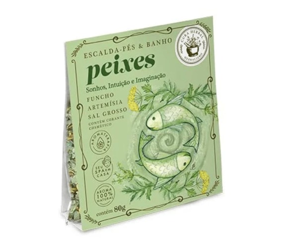 "Descrição: Os banhos de ervas possuem diversos benefícios medicinais que agem tanto no campo físico como espiritual. O Banho Astrológico de Peixes é composto de sal grosso, funcho e Artemísia para ativar sonhos, intuição e imaginação, na energia de todo pisciano.Benefícios do Banho de Peixes: - Calmante; - Inspira confiança e perseverança; - Transmite força e coragem.Composição: Funcho, Artemísia, Sal Grosso e Corante Cosmético.Modo de uso:ESCALDA-PÉS: Adicione a mistura de ervar e sal na água quente em um ofurô ou bacia e imerja os pés cuidadosamente.BANHO: Adicione a mistura de ervas em um infusor ou então saquinho de filó, imerja-o na banheira ou pendure no chuveiro. Você também pode acrescentar gotas de seu óleo essencial de preferência. "