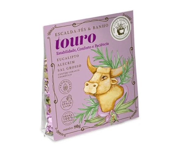 "Descrição: Os banhos de ervas possuem diversos benefícios medicinais que agem tanto no campo físico como espiritual. O Banho Astrológico de Touro é composto de sal grosso, alecrim e eucalipto mantém estabilidade, conforto, paciência e resistência, assim como a essência de todo taurino.Benefícios do Banho de Touro: - Clarear as ideias; - Estimula a energia feminina; - Traz relaxamento, calma e felicidade.Modo de uso:ESCALDA-PÉS: Adicione a mistura de ervar e sal na água quente em um ofurô ou bacia e imerja os pés cuidadosamente.BANHO: Adicione a mistura de ervas em um infusor ou então saquinho de filó, imerja-o na banheira ou pendure no chuveiro. Você também pode acrescentar gotas de seu óleo essencial de preferência. "