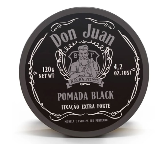 Barba Forte Don Juan Pomada Black Para Cabelo - Modela e estiliza seu penteado, e ao mesmo tempo pigmenta disfarçando barba e cabelos brancos - Solução ideal para dar aquele talento rápido no visual - Provém efeito com brilho e fixação forte de longa duração.