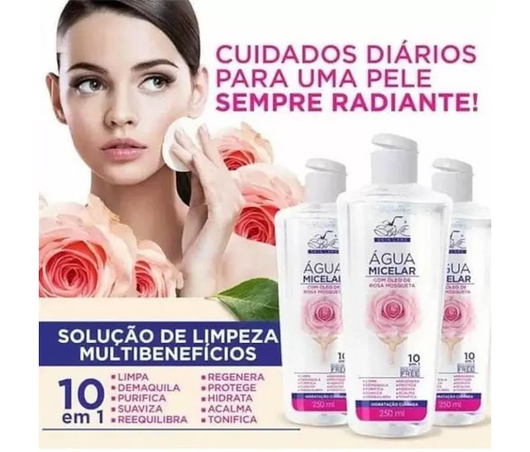 "Belkit - Água Micelar com Óleo de Rosa Mosqueta Hidratação Cutânea A Água Micelar Skin Care do Belkit é uma solução de limpeza dermatologicamente testada com benefícios 10 em 1. É prática e eficaz, desenvolvida especialmente para os cuidados diários que proporcionam 10 benefícios que fazem toda a diferença para a pele Sua formulação conta com o poder do Óleo de Rosa Mosqueta, que atua na regeneração cutânea, realizando uma autêntica hidratação dermoprotetiva. É uma solução de limpeza diária de rápida absorção. E conta com a tecnologia micelar, responsável por eliminar impurezas, resíduos de filtro solar, de poluição, maquiagem, oleosidade e ainda tonificar, mantendo e restaurando o equilíbrio cutâneo.