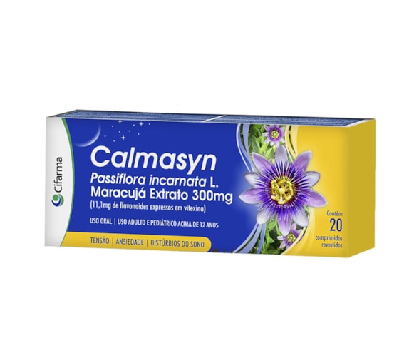 Calmasyn - Indicado para o tratamento da ansiedade leve, como estados de irritabilidade, agitação nervosa, tratamento de insônia e desordens da ansiedade - Composto pelo extratos de Passiflora Incarnata, atua no sistema nervoso central produzindo efeito sedativo e prolongando o período de sono.