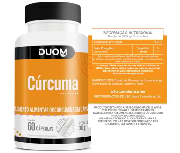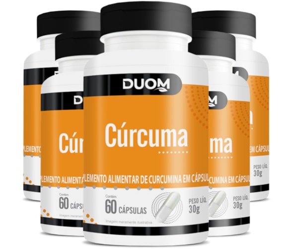 "COMBO COM 5 CÚRCUMA CURCUMINA 60 CÁPSULAS CADA – TOTAL 300 CÁPSULAS - DUOM — descrição — INDÚSTRIA DO CORPOPlanta originária do sudoeste asiático, utilizam-se as raízes (rizomas) secas e maceradas.Faz parte da Família das Zingiberaceae, é um produto pungente, amarga, adstringente, comcheiro característico e forte cor amarela. O CURCUMA (Curcuma Longa) é derivado de um condimento comum chamado curcuma. Contendo o mesmo composto exclusivo chamado curcumina, existente neste condimento tradicional, o CURCUMA apresenta vários minerais e vitaminas, sendo destaque o potássio, que auxilia para controle da pressão arterial e prevenção de derrames. Ainda se resume fonte da vitamina C, aliada em relação à imunidade, e também vitamina B6, que se caracteriza boa ao cérebro. Porém, o seu enorme valor está na curcumina, o polifenol de ação antioxidante e anti-inflamatória, que gera a cor amarela forte da curcuma. Trata-se de inúmeros os benefícios de curcumina, em especial pelo próprio efeito anti-inflamatório e antioxidante. — benefícios — INDÚSTRIA DO CORPO- Melhora o desempenho em atletas;- Diminui a fadiga;- Atua como estimulante energético no organismo, sem efeito rebote;- Aumenta a biogênese mitocondrial;- Diminui a produção de ácido lático e catabolismo no pós treino;- Retarda o avanço de doenças degenerativas;- Tem potente efeito anti-inflamatório, combatendo inflamações articulares;- Ação contra dores gástricas e menstruais. — sugestão de uso — INDÚSTRIA DO CORPOIngerir 2 cápsulas ao dia. — tabela nutricional — INDÚSTRIA DO CORPOANEXO NAS IMAGENS. — composição — INDÚSTRIA DO CORPOExtrato de Rizomas de Curcuma longa.Composição da Cápsula: Gelatina e Água. — recomendações — INDÚSTRIA DO CORPOPRODUTO DESTINADO A PESSOAS ACIMA DE 19 ANOS. ESTE PRODUTO NÃO É UM MEDICAMENTO. NÃO EXCEDER A RECOMENDAÇÃO DIÁRIA DE CONSUMO INDICADA NA EMBALAGEM. MANTENHA FORA DO ALCANCE DE CRIANÇAS. ESTE PRODUTO NÃO DEVE SER CONSUMIDO POR GESTANTES, LACTANTES E CRIANÇAS.Conservação: Conservar ao abrigo da luz, calor e umidade. Depois de aberto consumir em até 90 dias. — dados técnicos — INDÚSTRIA DO CORPOMarca – Duom.Conteúdo líquido por frasco – 60 cápsulas.Conteúdo líquido total – 300 cápsulas.Rendimento líquido por frasco – 30 doses/porções.Rendimento líquido total – 150 doses/porções.Peso líquido por frasco – 30g.Peso líquido total – 150g.Peso produto + embalagem (aproximado) – 350g.Código de barras (EAN) – 7898665751848.Registro ANVISA – Dispensado de registro de acordo com a resolução da RDC 27/2010 e RDC 240/2018 da ANVISA.Dimensões do produto – altura 11 cm; largura 6 cm; comprimento 6 cm.Dimensões da embalagem padrão – altura 7 cm; largura 13 cm; comprimento 16cm. — itens do anúncio — INDÚSTRIA DO CORPO5 Unidades do produto: CÚRCUMA CURCUMINA 60 CÁPSULAS CADA - DUOMTotal – 300 Cápsulas."