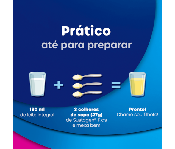 Sustagen é um complemento alimentar para uma alimentação equilibrada. Conta com uma combinação de 27 vitaminas e minerais e muito mais sabor e nutrição juntinhos para seu filho crescer forte e saudável. Contém vitaminas do complexo B, que participam da geração de energia; contém zinco e vitaminas A, C, D e E que contribuem para o sistema de defesa.