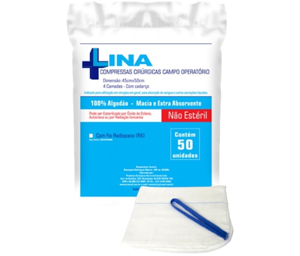A Compressa Cirúrgica Campo Operatório LINA é confeccionada com fios 100% algodão, em tecido quádruplo com fio radiopaco.