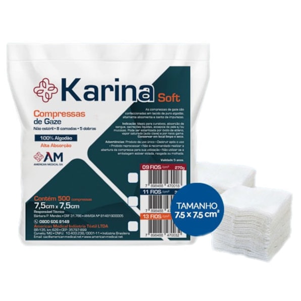 A Compressa de Gaze America Karina é fabricada 100% em algodão o que lhe dá alto poder de absorção, com 13 fios, 5 dobras e 8 camadas garante absorção, maciez e durabilidade para processos cirúrgicos ou de assepsia da pele. Sua medida de 7,5 x 7,5cm é ideal para curativos! Contém 500 unidades.