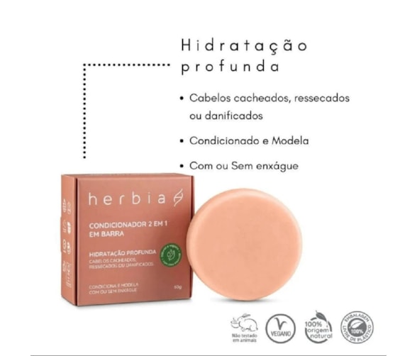 O Condicionador em Barra Natural 2 em 1 da Herbia é formulado com manteiga de karité, ácido lático e proteína de trigo, que nutrem, hidratam e combatem o ressecamento do couro cabeludo. Pode ser usado no condicionamento ou na modelagem dos fios.