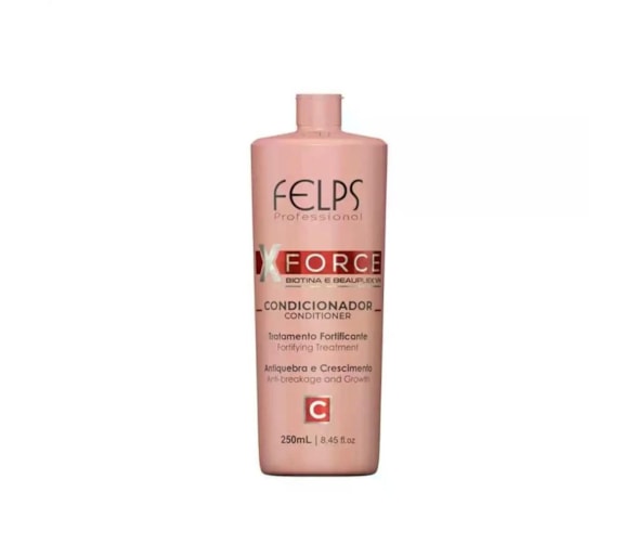 Fórmula enriquecida com Biotina, Óleos de Rícino e Coco, Beauplex VH (Blend de Vitaminas E, C, B3, B5 E B6), para todos os tipos de cabelo, principalmente os com dificuldade de crescimento. Com ação antiquebra, promove condicionamento, força, crescimento, brilho e fios saudáveis.. Modo de uso: Aplique o condicionador após o uso do shampoo ou máscara, massageando o comprimento dos fios e enxágue completamente. Para melhores resultados, convém utilizar associado aos demais produtos da linha Felps X Force. Precauções: Em caso de contato com os olhos, lavá-los imediatamente com água em abundância. Manter em local fresco e fora do alcance de crianças.