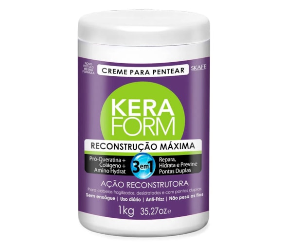 Skafe Keraform Reconstrução Máxima Creme Para Pentear - O Creme para Pentear Keraform Reconstrução Máxima 3 em 1 repara e hidrata contra as agressões e previne pontas duplas - Com Pró-Queratina + Colágeno + AminoHidrat, possui ação restauradora, devolvendo o brilho, maciez e a saúde aos fios.