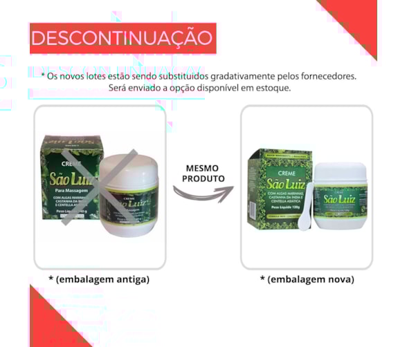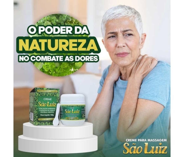 São Luiz é um creme para massagem natural composto por 7 ervas (Arnica, Centella Asiática, Algas Marinhas, Castanha da India, Óleo de Melaleuca, Própolis e Confrei) que produz intensa e agradável sensação de bem-estar, relaxamento e conforto nas regiões aplicadas. São Luiz esta no mercado a quase 30 anos e conta com mais de 2 milhões de clientes satisfeitos que usam e indicam o produto. Possui uma fragrância leve e agradável além de uma ótima absorção na pele. Este creme é composto por extratos naturais importados. Destinado a aliviar dores físicas, em especial, dores lombares, nos membros e articulações sendo indicado, também, para a solução de pequenas dores musculares.