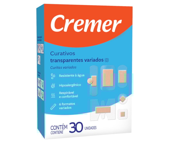 Os curativos transparentes variados cremer são prontos para uso e podem ser utilziados na prevenção e proteção de um ferimento. São resistentes à água e microperfurados, permitindo melhor circulação de ar pelo curativo, auxiliando no processo de cicatrização. Servem para diversas ocasiões, como esportes, uso doméstico e trabalho.