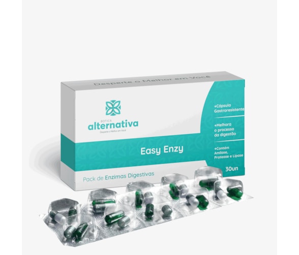 "Descubra o poder das enzimas digestivas com o Easy Enzy - Pack de Enzimas Digestivas 30 doses. Desenvolvido exclusivamente pela Botica Alternativa, este suplemento é formulado para proporcionar um suporte eficaz à digestão, permitindo que você aproveite ao máximo os nutrientes dos alimentos. Cada pack contém um mix cuidadosamente balanceado de Amilase, Protease e Lipase, enzimas essenciais para a decomposição de carboidratos, proteínas e lipídeos, respectivamente. Além disso, nossa fórmula inclui Pancreatina, uma combinação poderosa que ajuda na digestão e em deficiências pancreáticas, transformando gordura, proteína e amido em componentes mais facilmente absorvíveis pelo organismo.Com uma validade de 4 meses e um tratamento recomendado para 30 dias, basta tomar um pack 1 hora antes das principais refeições para sentir os benefícios. O produto é apresentado em duas cápsulas distintas: a primeira com Amilase, Protease, Pancreatina e Pepsina para atuação no estômago; enquanto a segunda, em cápsula gastroresistente, contém Lipase para absorção no intestino.Recomendado para adolescentes, adultos e idosos, o Easy Enzy é um aliado no combate à má digestão, azia e intestino preso. Isento de glúten e lactose, é seguro para uma ampla faixa de usuários, exceto aqueles com hipersensibilidade às substâncias. Não indicado para menores de 18 anos sem orientação médica. Gestantes e lactantes devem consultar um médico antes do uso. Garanta a eficácia do tratamento seguindo a posologia corretamente. Conclusivamente, em caso de sintomas persistentes, procure orientação médica. Priorize sua saúde com Easy Enzy, a solução prática e eficiente para seu bem-estar digestivo. Sob o respaldo e a expertise da Botica Alternativa, cada dose representa compromisso com a sua satisfação."