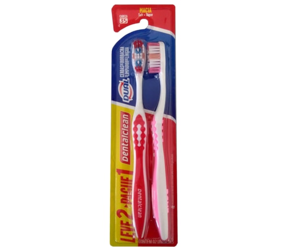 Escova de cerdas macias com pontas arredondadas, com borrachas circulares com que proporciona uma escovação de conforto. Contém limpador de língua que remove a placa bacteriana que causadora do mau hábito.