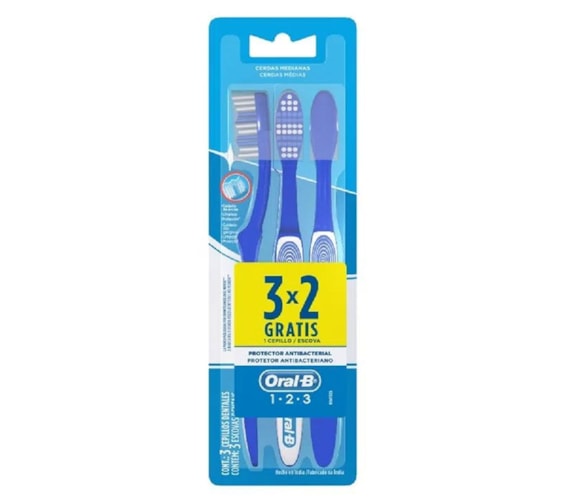 Escova Dental Oral-B 123 Média - Com cerdas de pontas arredondadas em forma de Z - Onduladas que limpam entre os dentes. Cuidar dos dentes de sua família agora é tão fácil quanto contar de 1 até 3.