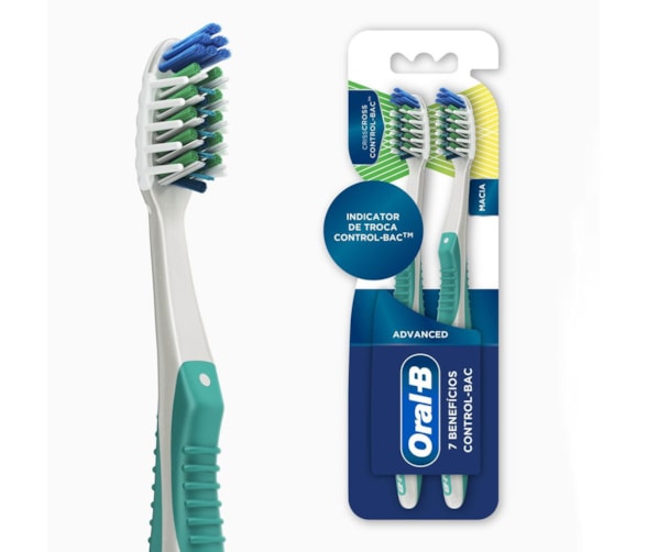 Escova Dental Oral-B Advanced 7 Benefícios Control-Bac Macia c/2 unidades - A escova Oral-B tem cerdas CrissCross que são projetadas para lhe dar melhor remoção da placa bacteriana, uma cabeça compacta que lhe permite alcançar áreas de difícil acesso e uma ponta ultra eficiente que ajuda a limpar em áreas difíceis - As cerdas foram especialmente arredondadas para limpar suavemente seus dentes, além de um limpador de língua para ajudar você a ter uma boca mais saudável - Para uma melhor experiência, recomendamos complementar sua rotina de escovação com os produtos que a Oral-B tem para você.