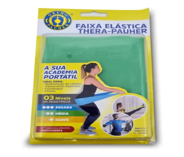 A Faixa Elástica possui sistema de resistência progressiva caracterizada por níveis crescentes de intensidade e resistência. Amarela = Suave, Azul = Moderado, Verde = Forte. Composição 100% TPR e Medidas em repouso de 1,3m x 16 cm.