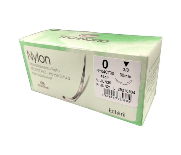 A sutura de Nylon Monofilamento Preto Technofio Fio de Sutura é do tipo não absorvível, estéril e composta por um fio de poliamida de cadeia alifática longa de polímeros de nylon.