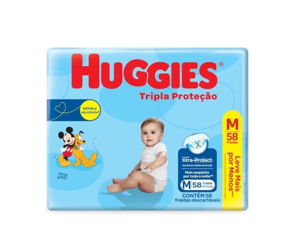 A fralda Huggies cuida do seu bebê e conta com: barreiras antivazamento, gel super absorvente e orelhas que abrem e fecham.