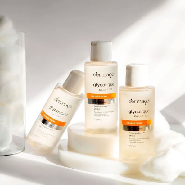 Glycolique Daily Peel Solução Facial Dermage - O Glycolique Daily Peel é um tônico facial de Ácido Glicólico concentrado a 7% - Com ação de peeling diário, promove a esfoliação química e a Renovação Celular da pele, além de potencializar o tratamento clareador de pele - Por ter Aloe Vera, ativo calmante e cicatrizante, em sua fórmula é indicado para todos os tipos de pele, até mesmo a pele sensível - O ácido glicólico é um ácido com alto fator de tolerância, sendo bem aceito por todos os tipos de pele - O Glycolique Daily Peel possui em sua composição Aloe Vera, ativo que possui ação calmante e regenerativa, o que faz com que o tônico de ácido glicólico seja adequado até mesmo para a pele sensível.