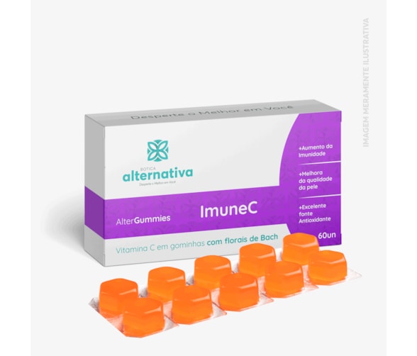 "Descubra o poder de AlterGummies ImuneC, uma fórmula inovadora projetada para fortalecer sua imunidade e resistência a infecções diárias. Este suplemento, composto por Vitamina C de 500mg e o floral de Bach Elm, atua como um potente antioxidante, protegendo sua pele e estimulando a produção de colágeno, além de auxiliar na absorção e armazenamento de ferro. A Vitamina C é essencial para o corpo, uma vez que nosso organismo não a produz naturalmente. Seu consumo diário através de nossas gomas saborosas com sabor ligeiramente adocicado de laranja facilita a adesão ao tratamento, tornando seu uso uma experiência agradável e eficaz. A presença do floral de Bach Elm oferece equilíbrio emocional, proporcionando força e estabilidade nos momentos de fraqueza, fortalecendo assim o bem-estar geral. Sob a supervisão da farmacêutica homeopata Dra. Adriana Wrublewski Machado Silva, com mais de 15 anos de experiência, garantimos que cada detalhe desta fórmula é cuidadosamente elaborado para promover sua saúde com amor.Recomendamos o consumo diário de apenas uma gominha para alcançar os melhores resultados. Com validade de três meses, nossas gomas são uma alternativa prática e sem glúten, segura para diabéticos e indicada para crianças a partir de cinco anos. Lembre-se, como em qualquer tratamento, os resultados podem variar e dependerão do uso correto do produto. Em caso de dúvidas ou persistência dos sintomas, consulte um profissional de saúde qualificado.Armazene em local fresco e protegido do sol, calor e umidade, garantindo a segurança e eficácia do produto. Evite a reutilização do frasco e mantenha fora do alcance de crianças menores de cinco anos. Esta descrição é um reflexo do compromisso da Botica Alternativa com a qualidade e eficácia dos seus produtos, baseado em nosso conhecimento científico e relações de fornecimento autorizadas pela Anvisa. Proporcione ao seu corpo e mente a melhor defesa com AlterGummies ImuneC."