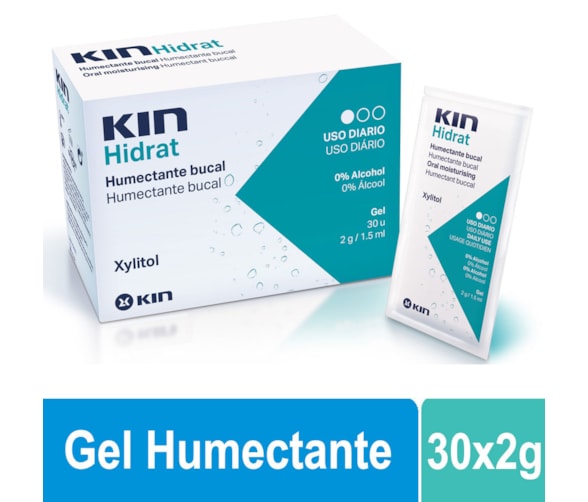 Kin Hidrat é um gel humectante bucal para a boca seca, uma consequência comum para aqueles que fazem uso de medicamentos (antibióticos, antidepressivos, anti-hipertensivos, diuréticos), portadores de diabetes, idosos e mulheres na menopausa. Sua fórmula exclusiva com alta concentração de Xilitol (10%) forma uma camada bioadesiva que atua como uma barrera protetora lubrificando, hidratando e refrescando a mucosa oral de forma imediata.