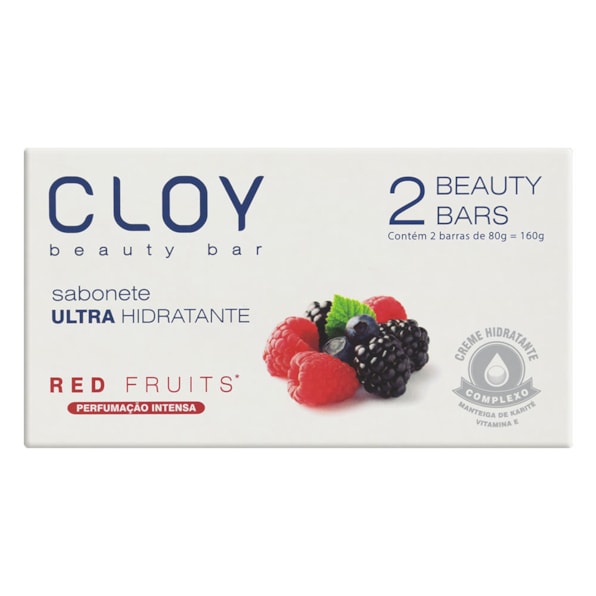 Kit 2x80g Cloy Beauty Red Fruits Sabonete Ultra Hidratante - Enriquecido com manteiga de Karité e Vitamina E, além de possuir um formato anatômico que facilita o uso durante o banho - As frutas vermelhas possuem propriedades que ajudam a retardar o envelhecimento da pele, pois são antioxidantes e ricas em vitaminas do complexo B - Limpam a sua pele sem ressecá-la, mantendo sua beleza natural.