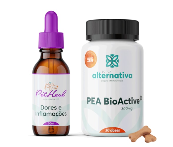 "Principal objetivo - Auxílio do tratamento de dores crônicas e inflamaçõesProdutos: - ?Pet Heal - Dores e Inflamações 30mL - BiscoPET - PEA BioActive® Dores e Inflamações 30 dosesValidade: - ?Pet Heal - Dores e Inflamações 30ml:3 meses - BiscoPET - PEA BioActive® Dores e Inflamações 30 doses: 4 mesesPosologia: - ?Pet Heal - Dores e Inflamações 30mlDar 5 gotas, 2x ao dia. Se preferir, diluir no bebedouro 10 gotas a cada troca.-Portes pequenos (até 5kg) – 3 gotas 2x ao dia ou 6 gotas no bebedouro - BiscoPET - PEA BioActive® Dores e Inflamações 30 doseAté 10 kg:1 biscoito 1x ao diaMais de 10 kg – 25 kg: 1 biscoito 2x ao diaMais de 25 kg: 1 biscoito 3x ao diaDescrição:O tratamento da dor crônica é desafiador e de difícil resolução. O Kit contém alternativas da linha Meu Pet Zen que auxiliam na manutenção dos sinais e sintomas provenientes de inflamações e dores. A homeopatia é indicado no tratamento auxiliar dores e distúrbios inflamatórios crônicos, formulação 100% natural. O biscoito conta com o nutracêutico PEA, que possui como alvo farmacológicos não apenas o receptor PPAR-alfa, mas também o GPRR55, um receptor canabinóide, potencializando a sua ação farmacológica no tratamento de dores e inflamações crônicas.Composição: - ?https://boticaalternativa.com.br/produto/pet-heal-dores-e-inflamacoes-30ml/ Arsenicum Album CH5 Apis Melifica CH3 Rhus Toxicodendron CH5 Nux Vomica CH5 Belladona CH3 Beberis Vulgaris CH6/ SEM ÁLCOOL. - BiscoPET - PEA BioActive® Dores e Inflamações 30 doses: PEA BioActive® 150mg/ Base Biscoito qsp."