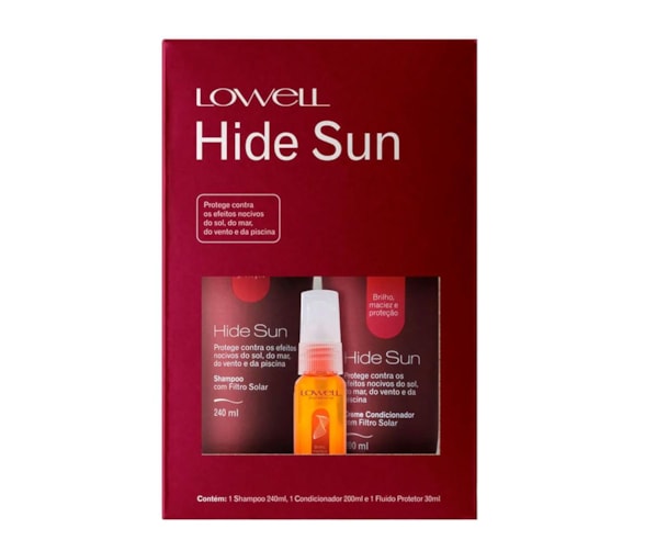 Kit Lowell Hide SunO que é:O Kit Lowell Hide Sun é a solução ideal para proteger seus cabelos durante os dias ensolarados e suas aventuras na praia ou piscina. Composto por um Shampoo, um Condicionador e um Fluído, este kit oferece uma proteção completa contra os danos causados pela exposição ao sol e à água, mantendo seus fios saudáveis e vibrantes.O que contém no Kit:Shampoo Hide Sun - 240ml: Formulado com um filtro solar especial que não se dissolve em água, este shampoo remove impurezas enquanto protege os cabelos das radiações UVB. Sua ação hidratante proporciona uma limpeza suave, deixando os fios prontos para receber os próximos passos do tratamento.Condicionador Hide Sun - 200ml: Este condicionador intensamente hidratante é perfeito para selar a umidade nos fios. Aplique após o shampoo para restaurar a maciez e o brilho, facilitando o desembaraço e protegendo contra os danos causados pelo sol e pela água.Fluído Hide Sun - 30ml: Um produto versátil que deve ser aplicado antes da exposição ao sol ou à água. Com apenas algumas gotas, você proporciona proteção adicional, mantendo a saúde dos cabelos enquanto evita que eles fiquem ásperos e sem vida.Indicação:Ideal para todos os tipos de cabelos, o Kit Hide Sun é perfeito para quem busca proteção eficaz contra os efeitos nocivos do sol, do mar, do vento e da piscina.Benefícios:Proteção contra danos causados pela exposição solar.Hidratação intensa que melhora a penteabilidade.Brilho e maciez visíveis.Maior durabilidade da cor dos cabelos, mantendo o tom vibrante.Modo de Uso:Shampoo Hide Sun: Aplique o shampoo sobre os cabelos úmidos e massageie até obter uma espuma abundante. Enxágue bem até remover totalmente o produto.Condicionador Hide Sun: Após usar o shampoo, aplique o condicionador do comprimento às pontas, massageando para facilitar a absorção. Enxágue até a retirada completa do produto.Fluído Hide Sun: Aplique de 4 a 6 gotas do fluído nas mãos e espalhe sobre os cabelos úmidos ou secos antes de entrar na água do mar ou piscina. Evite a raiz e reaplique ao longo do dia para proteção extra.Resultado:Cabelos hidratados, perfumados e cheios de saúde e brilho, com uma cor mais duradoura e proteção da cor natural dos fios. Prepare-se para aproveitar o sol com confiança, sabendo que seus cabelos estão bem cuidados!Experimente o Kit Lowell Hide Sun e mantenha seus cabelos radiantes mesmo sob o sol!