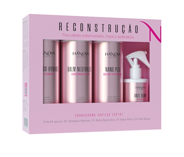 Kit Hanova Expert Box Reconstrução - A reconstrução é indicada quando os fios estão muito porosos, o que acontece principalmente devido à falta de queratina - Assim, a reconstrução tem como objetivo repor a queratina do cabelo, promovendo a saúde dos fios.