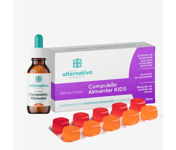 "Principal objetivo - Reduzir a ansiedade que desencadeia comportamentos de compulsão Alimentar.Produtos: - - Homeopatia para Compulsão Alimentar 60mL - Compulsão Alimentar KIDS - Goma Diet - Morango e Laranja 30unValidade: - Homeopatia: 6 meses - Gomas Diet: 4 mesesPosologia: - Homeopatia: Tomar 5 gotas 5x ao dia, sublingual. - Gomas Diet: Consumir 1 goma ao dia.Descrição:É muito comum as crianças relacionarem a comida uma solução para suas dificuldades em lidar com questões emocionais. Ao menor sinal de preocupação recorrendo a algum alimento para aliviar a tensão. Ou então, durante uma dieta específica, o excesso de fome pode atrapalhar o processo de emagrecimento infantil.O kit contém gomas com ativos naturais e floral e mais uma homeopatia. Ambos que auxiliam a redução da ansiedade que gera impulso de comer sem necessidade e também a saciedade, para auxiliar o desenvolvimento de uma relação mais saudável com a alimentação. - Homeopatia: China Officinalis CH3 ; Aloe Socotrina CH3; Agentum Nitricum CH6; Phosphorus CH3 ; Kalium Carbonicum CH5 Álcool qsp - Gomas: 5HTP 25mg, Passiflora 75mg , Proteína hidrolisada 3g, Floral de Minas Calmin, Base goma qsp "