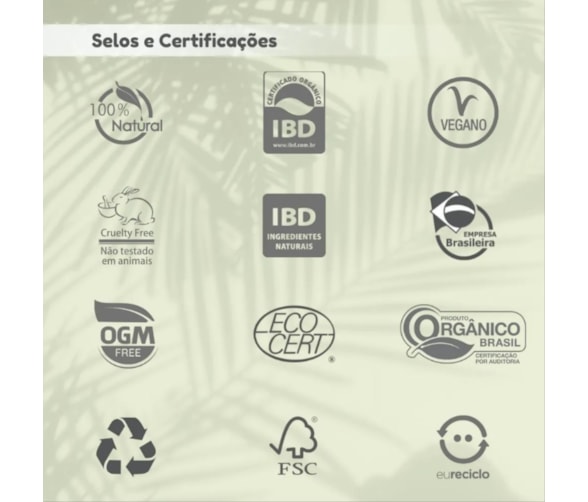 Fórmula livre de: parabenos, sulfatos, formaldeídos, corantes artificiais, fragrância sintética, derivados de petróleo, substâncias geneticamente modificadas e substâncias irradiadas e produtos de origem animal. Não é testado em animais.