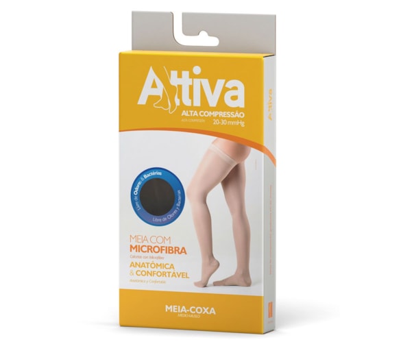 Meia 7/8 (Meia-Coxa) de Compressão Alta (20-30 mmHg) Attiva Ponteira Fechada Cor Preta, Tamanho P - Attiva é um produto terapêutico, produzido com avançada tecnologia, que exerce compressão graduada em todo membro inferior - A terapia de compressão ajuda a circulação sanguínea, diminuindo o diâmetro da veia dilatada e auxiliando o retorno venoso, o que diminui as dores, inchaço e sensação de pernas cansadas - A compressão graduada exerce 100% de sua compressão no tornozelo, diminuindo gradualmente até a coxa, fazendo com que a eficiência e eficácia da meia seja aumentada - Attiva previne varizes, veias varicosas, inchaço, câimbras, dores musculares, varizes gestacionais, síndrome do viajante, formação de coágulos sanguíneos e trombose venosa, e é essencial no tratamento de doenças venosas e linfáticas - Para o tamanho adequado veja a tabela de medidas exposta no rodapé da embalagem.