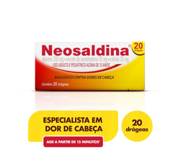 NEOSALDINA é um medicamento com atividade analgésica (diminui a dor) e antiespasmódica (diminui contração involuntária) indicado para o tratamento de diversos tipos de dor de cabeça, incluindo enxaquecas ou para o tratamento de cólicas. O seu início de ação ocorre entre 15 a 30 minutos após sua administração oral e permanece por 4 a 6 horas.