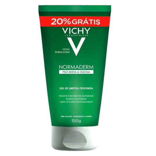 Normaderm Gel de Limpeza Profunda Antiacne Facial Vichy - Proporciona uma limpeza profunda da pele removendo células mortas e impurezas - Além disso, é ideal para diminuir imperfeições como poros obstruídos, poros dilatados e brilho excessivo - Indicado para peles mistas a oleosas - Substitui o sabonete líquido.
