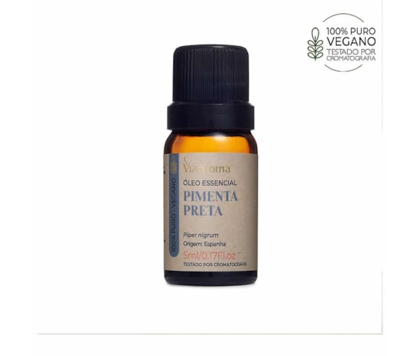 "Óleo Essencial Pimenta Preta - Via Aroma 5mlNome científico: Piper nigrumOrigem: EspanhaProcesso de extração: arraste a vaporParte da planta: sementesDescrição olfativa: especiado e apimentadoO Óleo Essencial de Pimenta Preta é considerado o óleo essencial da vitalidade, pois seu aroma quente fortalece a coragem e a ação, ajuda em momentos de busca do novo e na quebra de condicionamentos. É um excelente antidepressivo, afrodisíaco, analgésico, anti-inflamatório, vasodilatador e estimulante da produção de endorfina. É muito utilizado em massagens e drenagens linfáticas por ativar a circulação, ajudar a queimar calorias e eliminar toxinas.Armazenar em local bem ventilado, em embalagem fechada e protegido da luz.A Via Aroma recomenda a utilização dos óleos essenciais no aromatizador elétrico. Para outros tipos de utilização, procure a orientação de um profissional habilitadoe especializado em Aromaterapia."