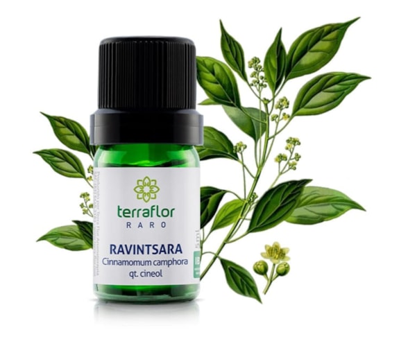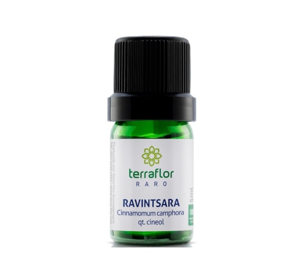 O Óleo Essencial Raro de Ravintsara da Terra Flor possui um aroma canforado que estimula a mente e purifica o ambiente. Melhora a capacidade de comunicação e aumenta a concentração e o foco. O óleo essencial de ravintsara tem propriedades antisséptica, antiviral, antibacteriana, expectorante e anti-infeccioso, auxiliando no combate de afecções respiratórias como sinusite, rinite, gripe, bronquite e tosse.