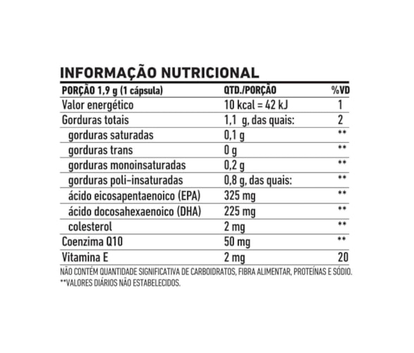 Ômega-3 (325 mg EPA + 225 mg DHA + 50 mg CoQ10) - Produto a base de óleo de peixe associado com a Coenzima Q10 - O óleo de peixe extraído de águas frias e profundas das regiões polares, sendo rico em ácidos graxos de cadeia longa, da série Ômega-3 - Seus constituintes são: o Ácido Eicosapentaenóico (EPA) e o Ácido Docosahexaenóico (DHA), sendo considerados ácidos graxos essenciais - Também possui Vitamina E em sua composição - O consumo de ácidos graxos Ômega 3 auxilia na manutenção de níveis saudáveis de triglicerídeos, desde que associado a uma alimentação equilibrada e hábitos de vida saudáveis.