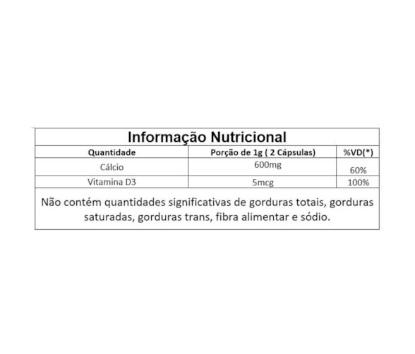Carbonato de cálcio mineral, vitamina D3 (Colecalciferol), lubrificante estearato de magnésio e antiumectante dióxido de silício.