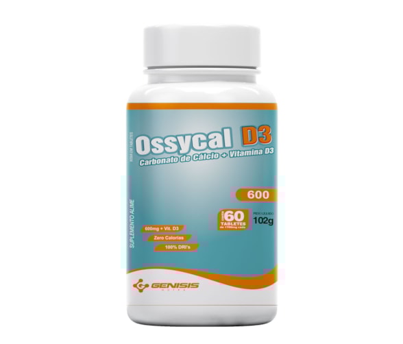 O OSSYCAL da GENISIS é um suplemento alimentar composto por carbonato de cálcio mineral e vitamina D3, essa combinação em quantidades adequadas auxiliam na prevenção e no tratamento da desmineralização óssea, ou seja, enfraquecimento dos ossos com o decorrer dos anos, podendo ser um desgaste natural ou por algum problema de saúde (osteoporose), também é indicado para mulheres antes e após a menopausa - O OSSYCAL da GENISIS, é indicado para todos os indivíduos saudáveis acima de 19 anos de idade - Por estar na apresentação de tabletes (comprimidos), seu transporte e armazenamento é prático e fácil, facilitando seu consumo no dia à dia.