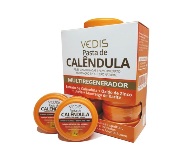 "benefícios: A Pasta de Calêndula Vedis forma um filme protetor sobre a pele deixando-a macia e hidratada. Foi produzida com Uréia, Óxido de Zinco e Extrato Vegetal de Calêndula, uma planta conhecida por suas ações terapêuticas – a Calêndula possui propriedades regenerativas que ajudam na recuperação de peles irritadas, reduz a vermelhidão e tem grande poder de hidratação. Recomendada para peles rachadas, levemente queimadas, secas e desidratadas. Muito usado para aliviar o incômodo causado pela rosácea. "