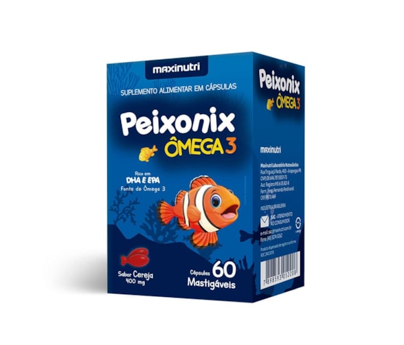 "Óleo de peixe, óleo de soja, aroma de cereja, óleo essencial de laranja glaceante cera de abelha, emulsificante lecitina de soja e edulcorantes sucralose e xilitol Composição da cápsula gelatina, amido modificado, água purificada, umectante glicerina, aroma de cereja, edulcorante sucralose e corantes carmim e vermelho 40.Sugestão de usoIngerir 2 cápsulas ao dia.ConservaçãoConservar ao abrigo da luz, calor e umidade.Após aberto consumir em até 60 dias.Rendimento30 porções."
