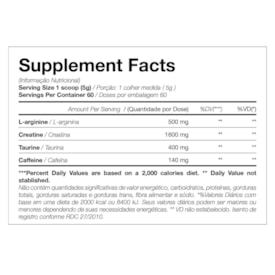 -Cafeína: melhora da cognição, foco e performance. -Taurina: aumento da resistência no período de treinamento devido ao seu efeito ergogênico.(1) -Arginina: atua na vasodilatação aumentando a resistência no período de treinamento e retardando a fadiga muscular. -Creatina: aumento de força e de produção de ATP, muito utilizada na nutrição esportiva pela sua relação ao metabolismo energético, contribuindo para o aumento da força e retardando a fadiga muscular.