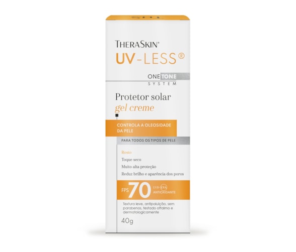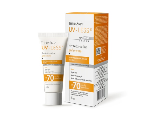 Cuidar da pele é parte essencial da saúde. O sol, a poluição e até a luz emitida por telas podem gerar danos como envelhecimento precoce, manchas e até câncer de pele. O uso do protetor solar facial é a forma mais eficaz de prevenir esses problemas e deve fazer parte da rotina diária de cuidados. Pensando nas necessidades específicas da pele brasileira, a TheraSkin desenvolveu o UV-Less® TheraSkin®, disponível nas versões incolor, que oferecem alta proteção solar e benefícios adicionais para manter a pele saudável. O UV-Less® TheraSkin® é um protetor solar facial FPS 70 que protege contra radiação UVA, UVB e também contra a luz azul. Seu diferencial está no fator UVA 30, um dos mais altos do mercado brasileiro, fundamental para a prevenção de manchas, melasma e sinais de envelhecimento. Versão incolor: tem acabamento imperceptível, adapta-se a qualquer tom de pele e pode ser usada por todos, sem deixar resíduo esbranquiçado.