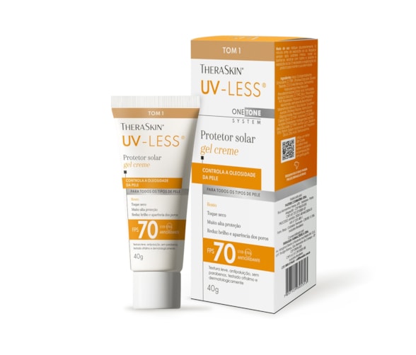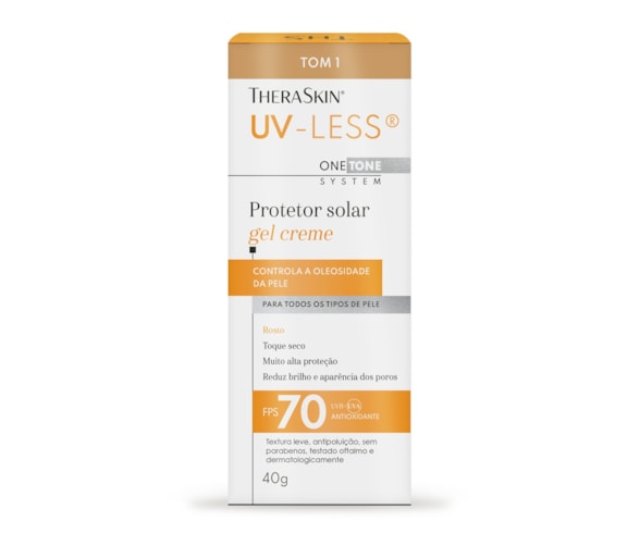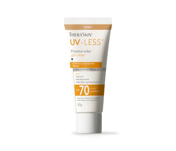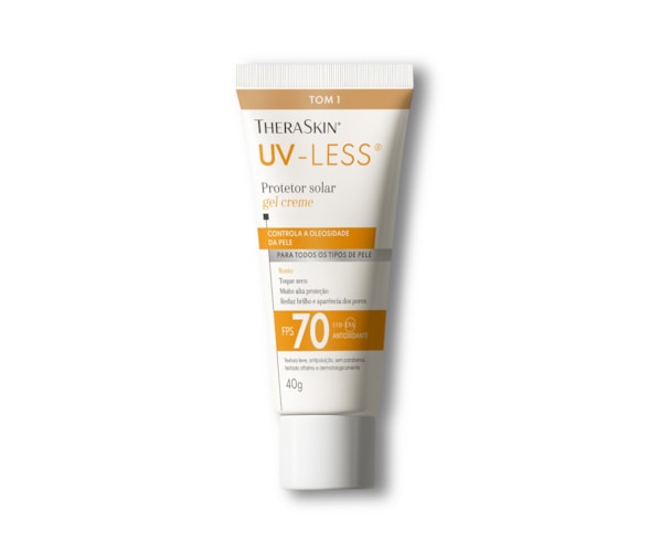 O UV-Less® TheraSkin® é um protetor solar facial FPS 70 que protege contra radiação UVA, UVB e também contra a luz azul. Seu diferencial está no fator UVA 30, um dos mais altos do mercado brasileiro, fundamental para a prevenção de manchas, melasma e sinais de envelhecimento. Tom 1 que atende à diversidade da pele brasileira. Além da proteção solar, funcionam como um protetor solar facial com base, ajudando a uniformizar a pele.