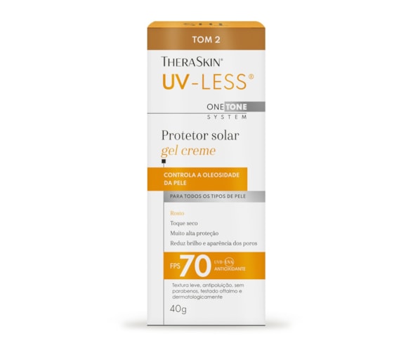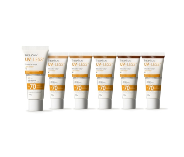 O UV-Less® TheraSkin® é um protetor solar facial FPS 70 que protege contra radiação UVA, UVB e também contra a luz azul. Seu diferencial está no fator UVA 30, um dos mais altos do mercado brasileiro, fundamental para a prevenção de manchas, melasma e sinais de envelhecimento. Tom 2 que atende à diversidade da pele brasileira. Além da proteção solar, funcionam como um protetor solar facial com base, ajudando a uniformizar a pele.