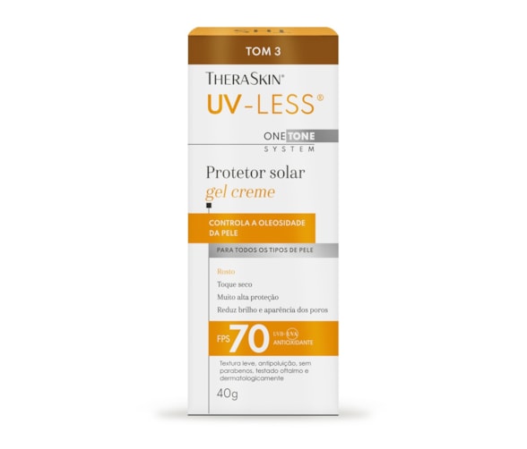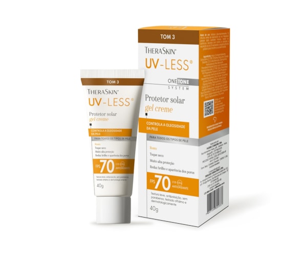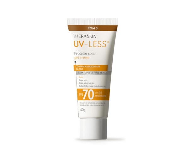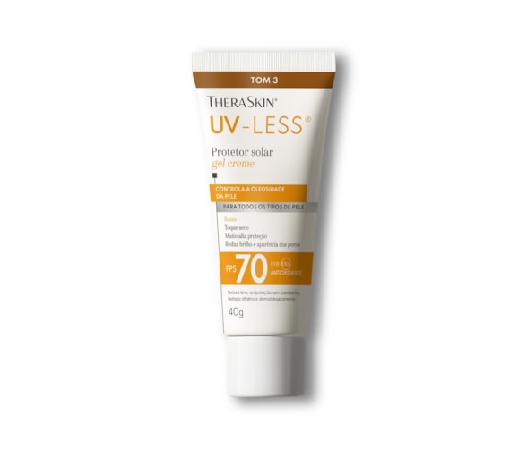 O UV-Less® TheraSkin® é um protetor solar facial FPS 70 que protege contra radiação UVA, UVB e também contra a luz azul. Seu diferencial está no fator UVA 30, um dos mais altos do mercado brasileiro, fundamental para a prevenção de manchas, melasma e sinais de envelhecimento. Tom 3 que atende à diversidade da pele brasileira. Além da proteção solar, funcionam como um protetor solar facial com base, ajudando a uniformizar a pele.